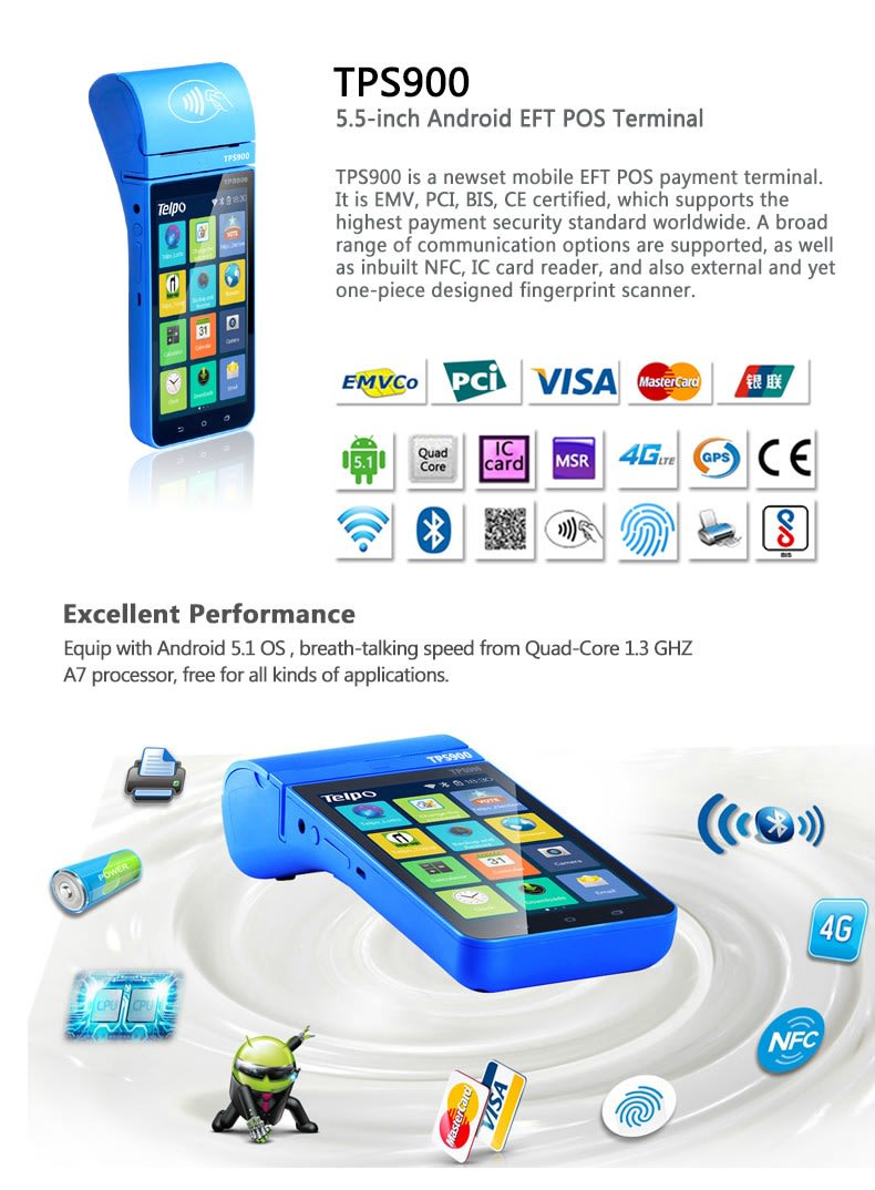 Along with the development of the payment technology, EFTPOS also combine with biological recognition technologies, such as Telpo TPS900 combines the fingerprint recognizer. To secure payment required, EFTPOS also will be with face recognition, iris recognition, and so on.Telpo welcome together development and customization.